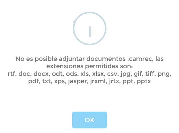 En caso de que intentemos subir un archivo con formato no permitido, aparecerá el siguiente mensaje, indicando las extensiones permitidas en la instalación en que nos encontremos:
